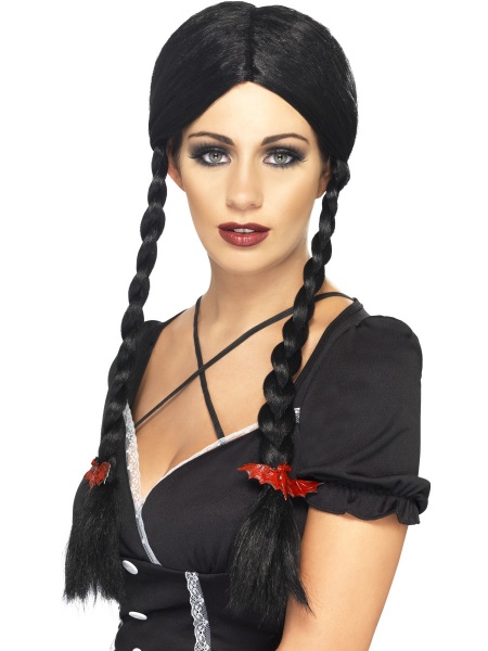 Dlhá čierna parochňa spletená po stranách do dvoch vrkočov zdobených červenými netopiermi.